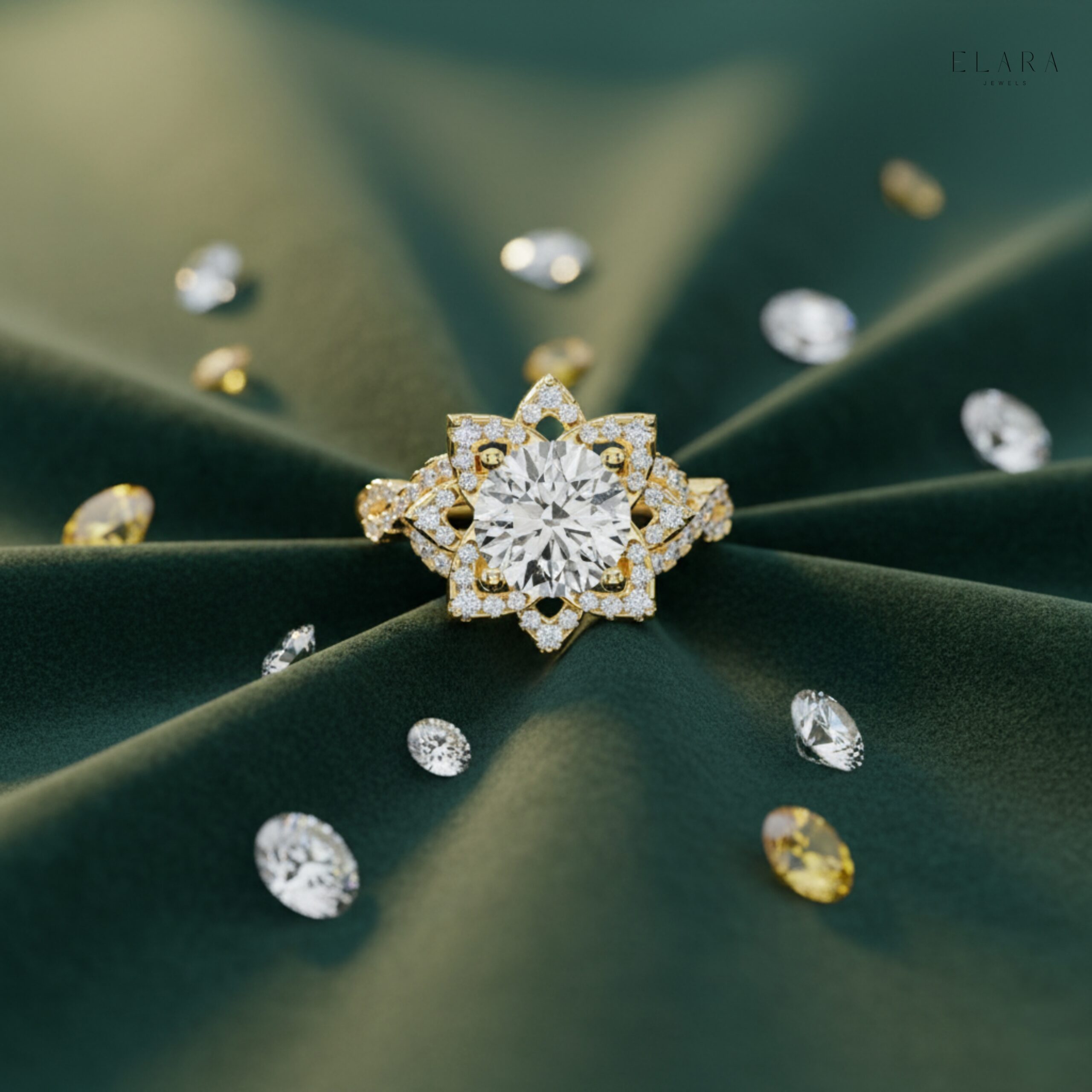 This exquisitely handcrafted Lotus Floral Halo Moissanite & Diamond Ring combines timeless romance with intricate vintage craftsmanship. Featuring 61 handset stones and a stunning 7.40 mm round center, this piece is designed to achieve maximum brilliance with a unique lotus-petal halo and twisted pavé band. Every diamond is precisely selected and hand-set to create a breathtaking sparkle from every angle.