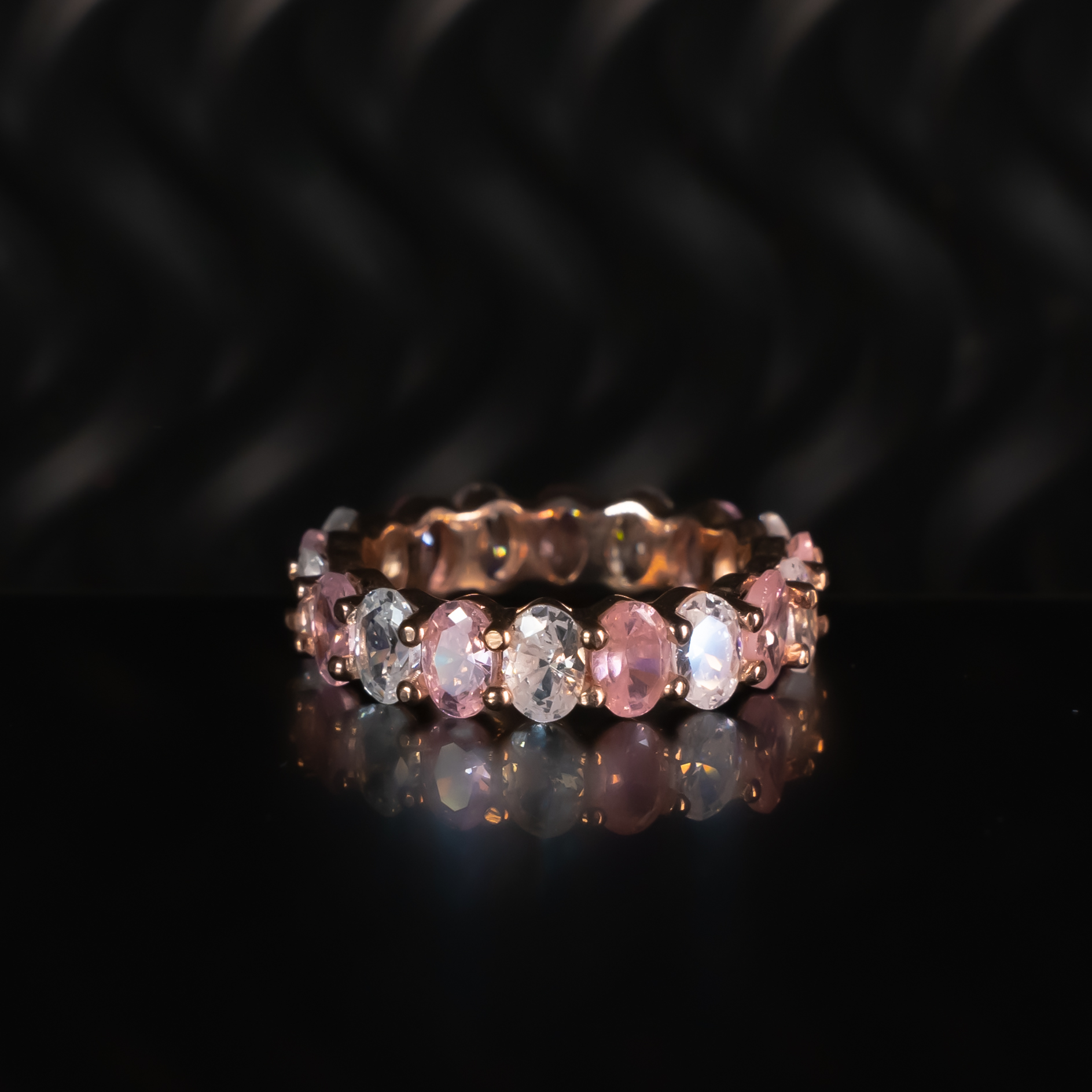 Romantic 14K rose gold full eternity ring featuring alternating blush pink and clear gemstones, radiating soft elegance and sparkle.