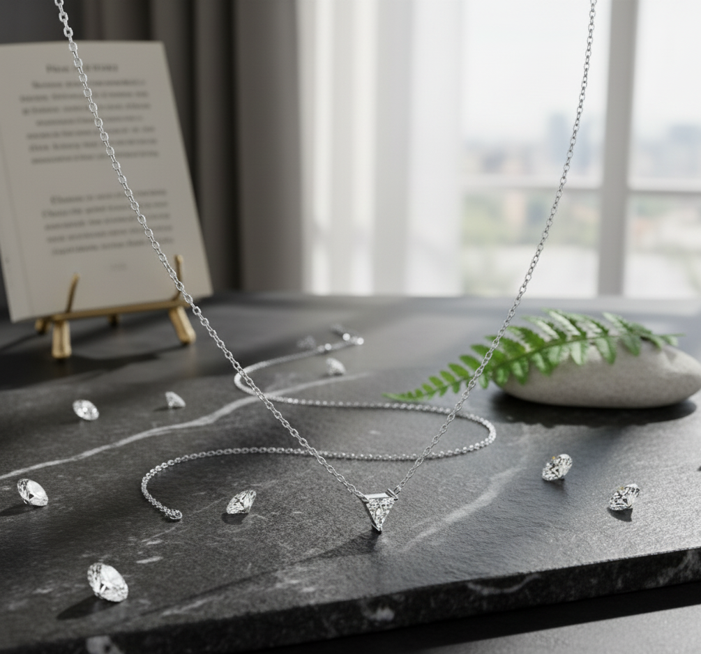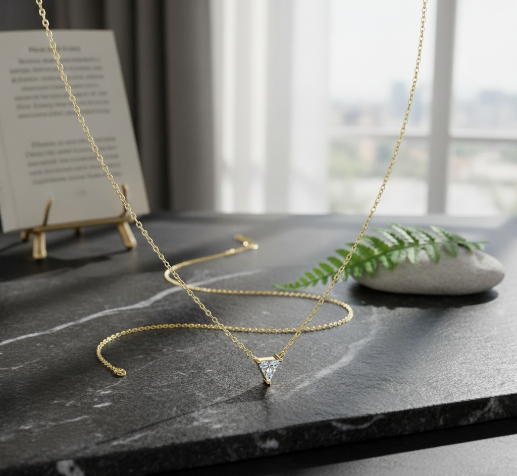 The Trinity Spark Necklace captures modern elegance in its purest form. Featuring a dazzling trillion-cut moissanite that radiates brilliance from every angle, this piece symbolizes strength, balance, and harmony. Expertly crafted in 925 sterling silver with your choice of rose gold or gold plating, it’s the perfect blend of sophistication and simplicity.